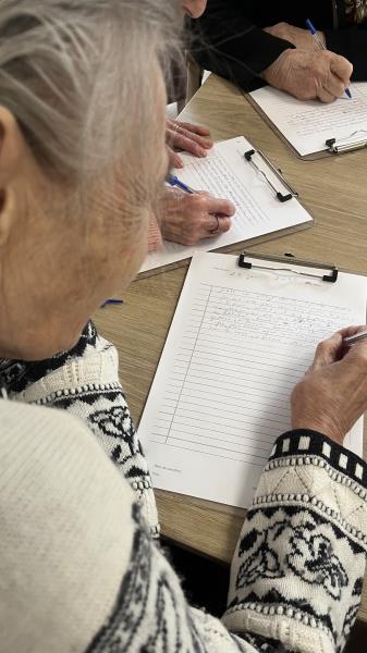 Cette fois-ci, l’atelier prend la forme d’une dictée originale et ludique : le but n’est pas de vérifier les fautes d’orthographe ni la qualité de l’écriture, mais de découvrir ou redécouvrir un auteur ou un texte, soigneusement choisi par l’animatrice.