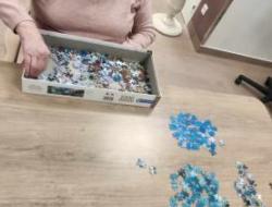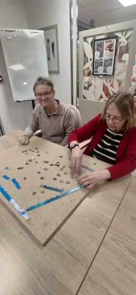 Accompagnés par la psychomotricienne et l'assistante de soins en gérontologie, les résidents ont débuté un puzzle, une activité pas si simple mais qui possède de nombreuses vertus :